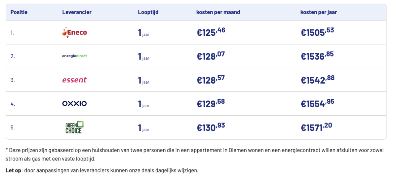 Het kan zijn dat jij in onze vergelijker andere tarieven ziet dan die hierboven staan. Dat komt omdat de energietarieven in onze vergelijker gebaseerd op de gegevens die jij hebt ingevuld (het aantal personen in je huishouden, je woonsituatie en je geschatte jaarlijkse energieverbruik). Ook de gekozen looptijd van het contract, bijvoorbeeld 1 of 3 jaar, heeft invloed op wat je betaalt voor je energiecontract.