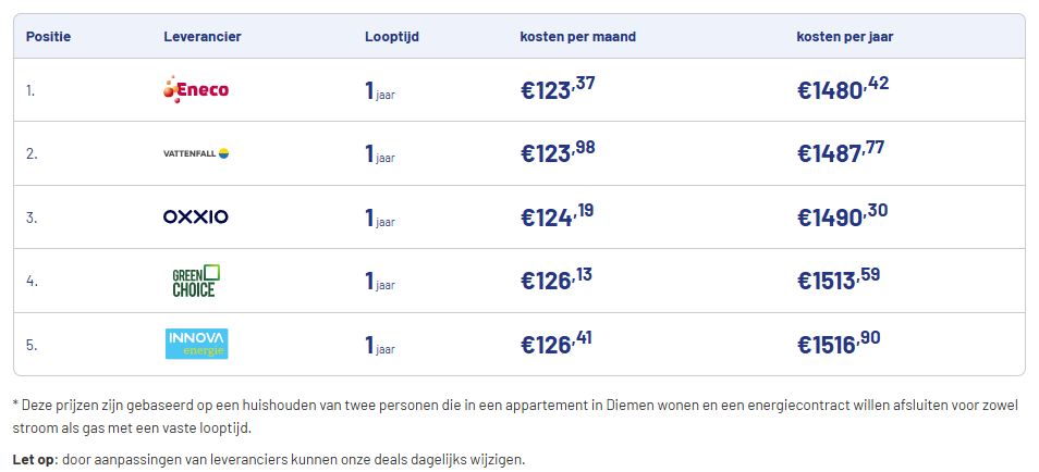 Hieronder zie je de vijf goedkoopste energiecontracten van november 2025. Aangezien de energieprijzen regelmatig veranderen, kan er morgen een ander energiecontract het goedkoopst zijn.