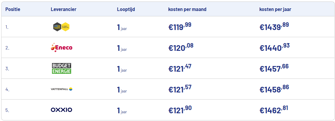 Let op: de energieprijzen wisselen voortdurend. Het kan dus zijn dat er morgen een ander energiecontract het goedkoopst is.