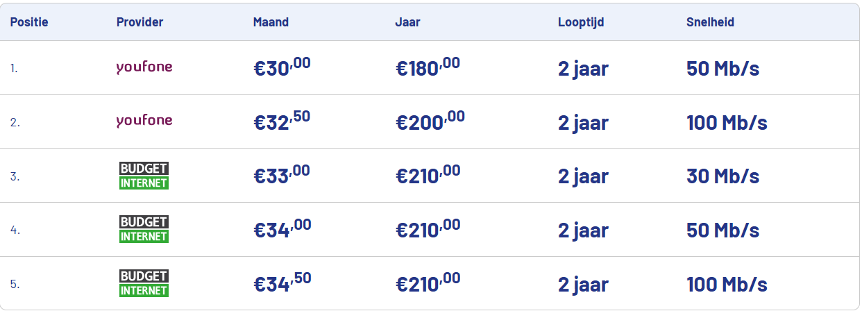 Hieronder zie je de vijf voordeligste abonnementen van deze maand. Let op: de maandprijzen zijn exclusief tijdelijke acties. De welkomstkortingen zijn al verwerkt in het jaartotaal, zodat je meteen weet wat je jaarlijks precies betaalt.