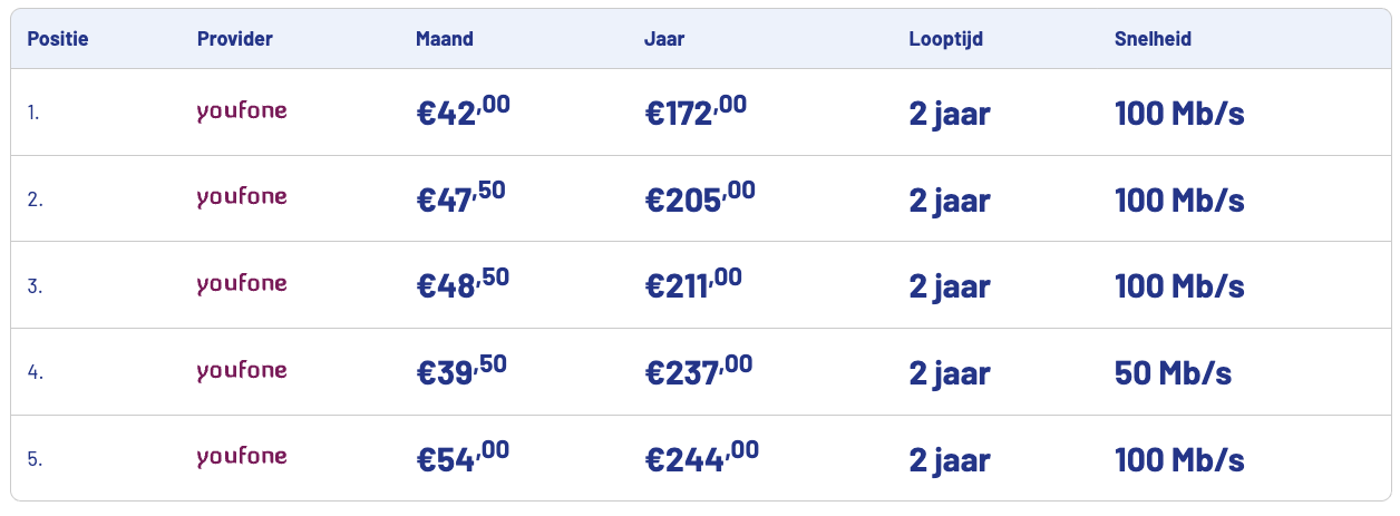Hieronder zie je de vijf goedkoopste abonnementen van deze maand. Let op: de prijzen die onder het kopje ‘Maand’ zijn exclusief (tijdelijke) acties. Onder het kopje ‘Jaar’ staan de prijzen inclusief acties (zoals welkomstkorting). Zo zie je meteen wat je écht betaalt per jaar.