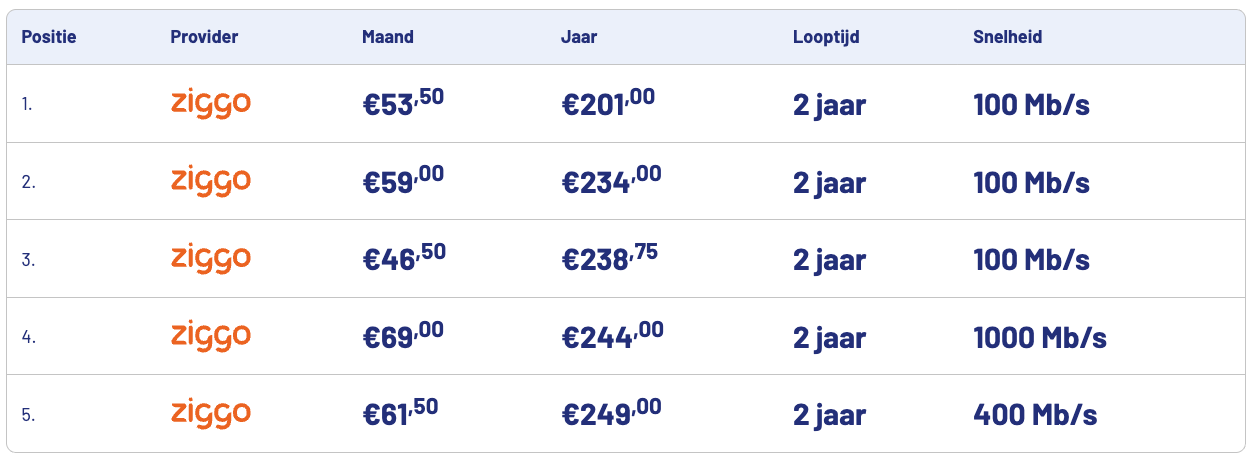 Hieronder zie je de vijf goedkoopste abonnementen van deze maand. Let op: de prijzen die je ziet onder het kopje ‘Maand’ zijn exclusief (tijdelijke) acties. In de prijzen onder het kopje ‘Jaar’ zijn deze acties, zoals welkomstkorting, wél verwerkt. Zo zie je meteen wat je per jaar écht betaalt.