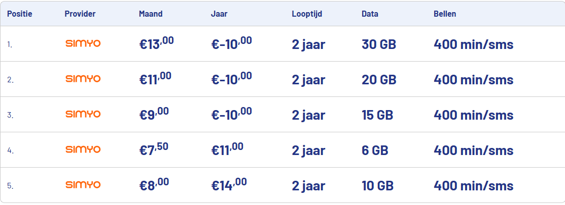 Hieronder vind je de scherpste sim only-aanbiedingen van deze maand. Onder het kopje ‘Maand’ zie je de prijs zonder tijdelijke acties. Bij ‘Jaar’ zijn eventuele kortingen al meegerekend. Zo zie je precies wat je het eerste jaar écht betaalt.