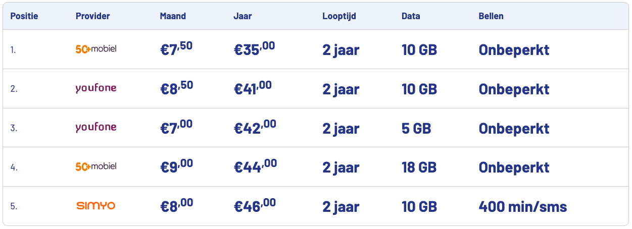 Hieronder zie je de meest voordelige sim only-deals van oktober. Onder ‘Maand’ zie je de zonder tijdelijke kortingen of cashbackacties. In de prijzen onder het kopje ‘Jaar’ zijn deze wél verwerkt. Zo zie je meteen wat je het eerste jaar écht betaalt.