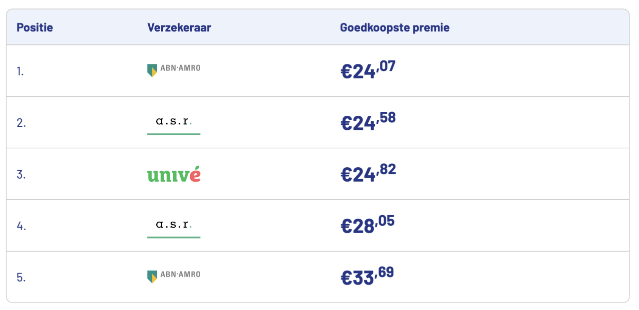 Let op: de premie die je uiteindelijk betaalt, hangt af van jouw persoonlijke situatie. De hoogte van de premie wordt namelijk bepaald door verschillende factoren, zoals je adres, het type woning en de dekking die je kiest. Daardoor kunnen bovenstaande bedragen afwijken van wat jij ziet in de vergelijker nadat je je gegevens hebt ingevuld. Daarnaast passen verzekeraars hun tarieven regelmatig aan, waardoor de prijs dagelijks kan veranderen.